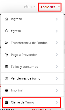 3- Vamos a seleccionar el botón de Acciones - Cierre de Turno, arriba a la derecha, dentro de caja diaria.
