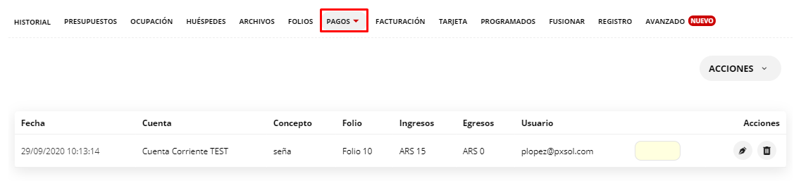 2-Dentro de la reserva posicionarnos en la solapa Pagos donde se visualizarán los pagos registrados: