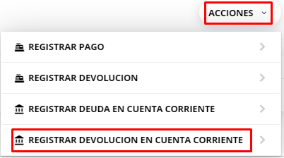 3- En el ícono de acciones, seleccionar Registrar Devolución en Cuenta Corriente.