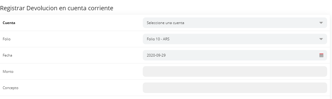 4- Se desplegarán campos donde podrá indicar la cuenta corriente a la que quiere registrar la devolución, el folio, la fecha, el monto y una descripción.
