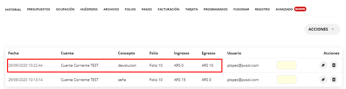6- Este movimiento se visualizará dentro de la solapa pagos de la reserva.