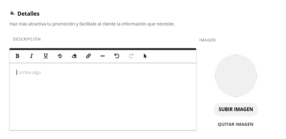 5- En el último campo de esta ventana encontrará Detalles, donde podrá ingresar la descripción de la promoción y una imagen, lo que permitirá obtener una promoción más atractiva.