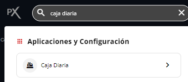 O desde el buscador superior, escribir dentro del buscador Caja Diaria y cliquear sobre la aplicación Caja Diaria.