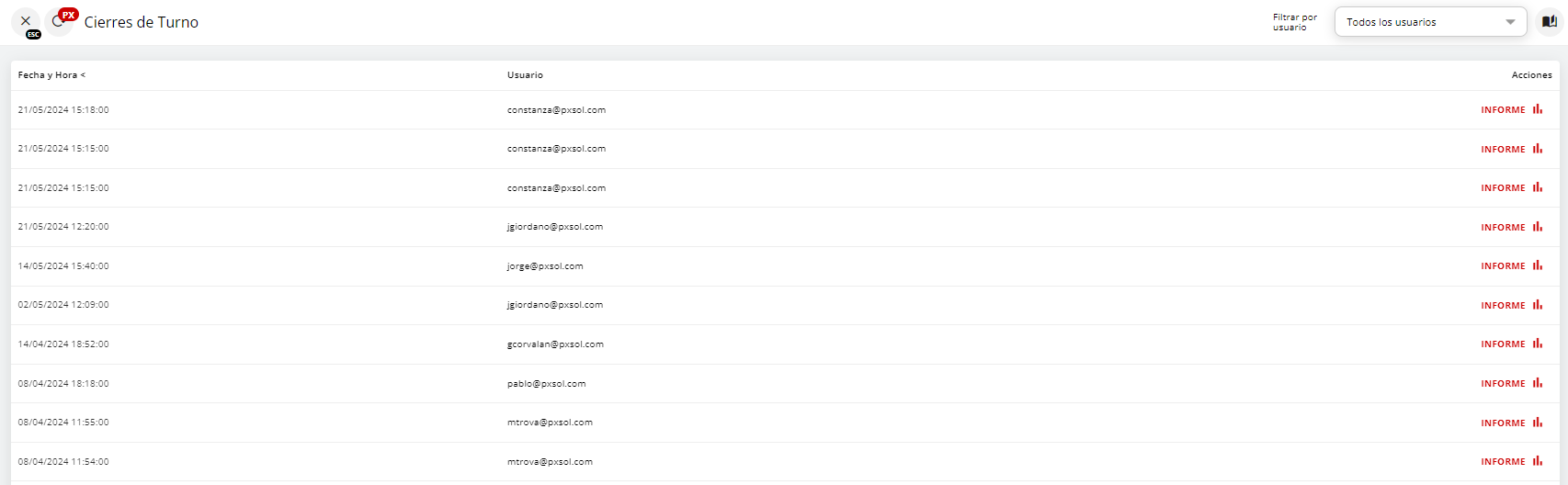 3- Nos aparecerá una ventana que nos mostrará los cierres de turno históricos con la fecha y hora en la que se realizó y el usuario