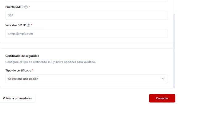 - Tipo de certificado: seleccionar, TLS, SSL o ninguno según corresponda.