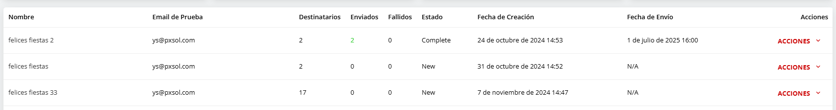 - Estado: Mostrará en estado New cuando se haya creado una campaña pero no se haya enviado. Una vez enviada mostrará Complete