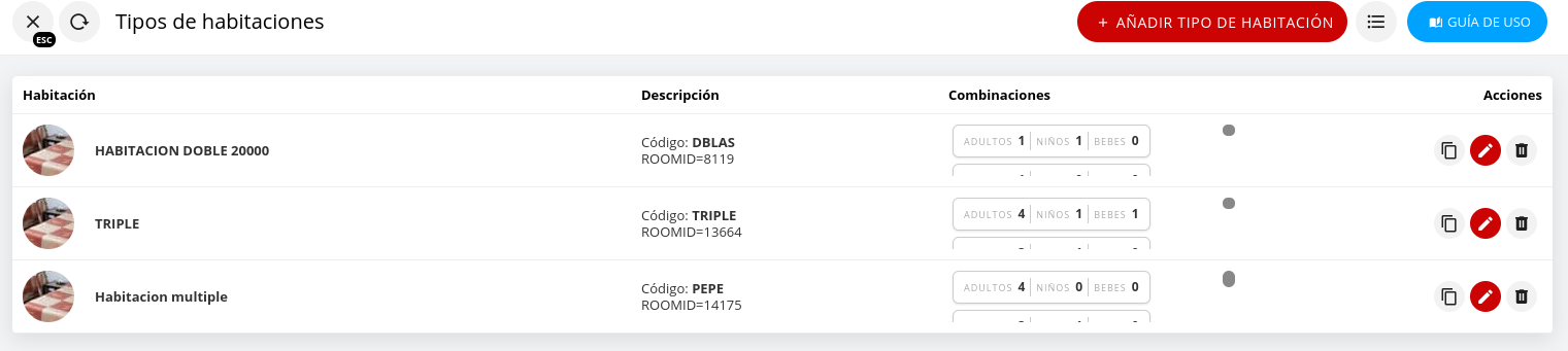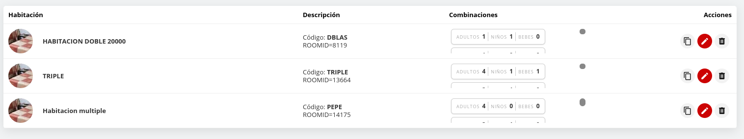 - Combinaciones: Muestra todas las posibles combinaciones de pasajeros que admite ese tipo de habitación