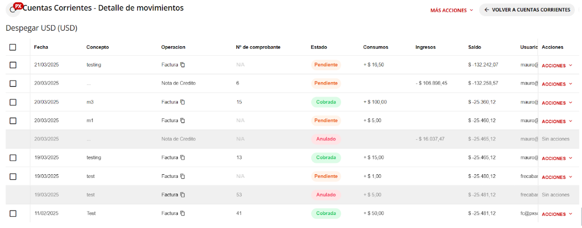 - Control y acciones: Muestra el mail del usuario que firmó ese movimiento o muestra las acciones que se pueden realizar como imprimir, firmar, borrar.
