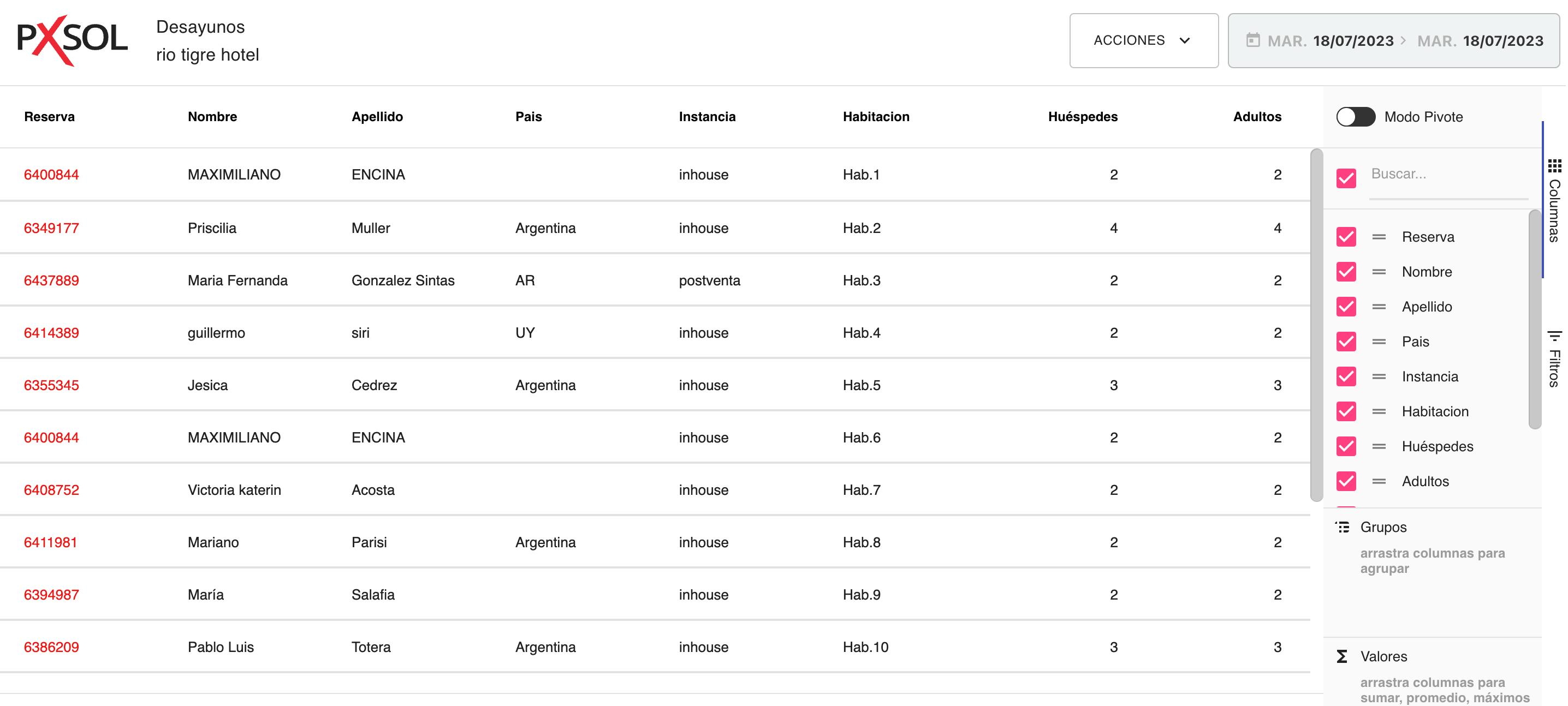 En este informe podremos observar todas las reservas que tienen incluido el desayuno en el día de la fecha con algunos datos de la reserva como Nombre, Apellido, País, Instancia, Habitación y cantidad de huéspedes
