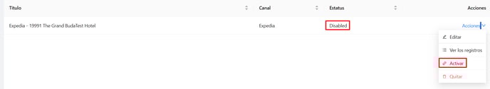 Una vez completada la configuración, al cerrar la ventana, el canal aparecerá con el estado DISABLE. Para activarlo, haz clic en Acciones y selecciona ACTIVAR. Esto establecerá la conexión con el portal.