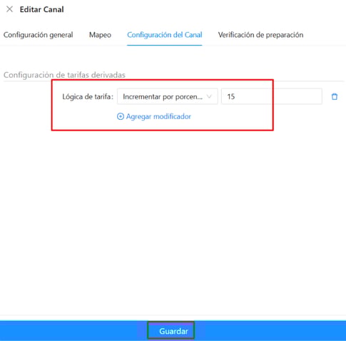 - Por ejemplo, si es necesario enviar a este canal un precio un 15% mayor al registrado en Pxsol, puedes configurar el incremento en porcentaje desde aquí.