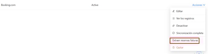 Opcional: Una vez activada la conexión, si deseas descargar todas las reservas activas de Booking.com con check-in a futuro, puedes hacerlo haciendo clic nuevamente en Acciones y seleccionando Extraer reservas futuras.