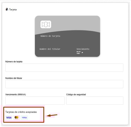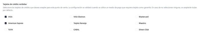 - Tarjetas recibidas: Selecciona las tarjetas de crédito que deseas aceptar como métodos de pago o garantía. Si eliges algunas tarjetas específicas, los pasajeros no podrán avanzar en el proceso de reserva si intentan utilizar una tarjeta que no esté entre las aceptadas; en ese caso, el motor les indicará cuáles son las tarjetas válidas y les solicitará que elijan otra opción. Si no seleccionas ninguna tarjeta, el sistema aceptará todas las tarjetas de crédito por defecto.