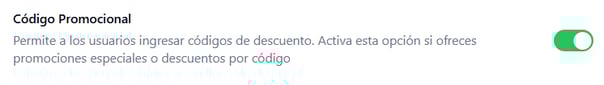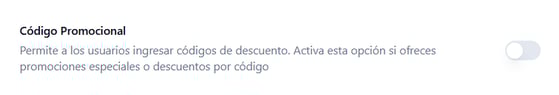 - Código promocional: esta opción te permite habilitar o deshabilitar el campo para ingresar un código promocional, según si tu negocio utiliza o no descuentos a través de promociones que requieren un código.