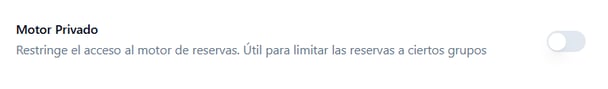 - Motor privado: al activar esta opción, se restringe la posibilidad de realizar reservas únicamente a aquellas personas que cuenten con un acuerdo previo. Para poder reservar, los usuarios deberán registrarse en el momento de la solicitud. Si poseen el permiso correspondiente, podrán continuar con el proceso de reserva; de lo contrario, no podrán avanzar.