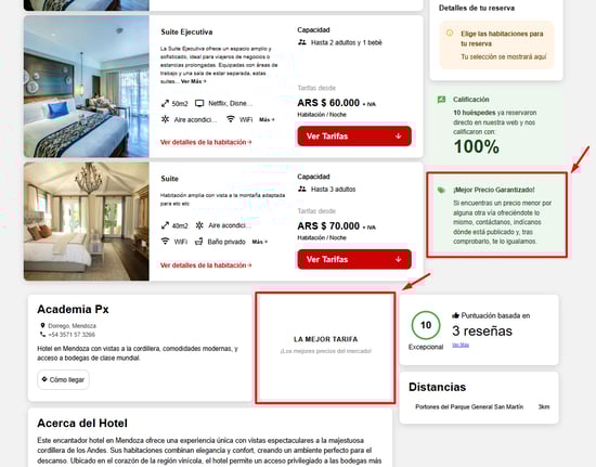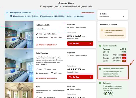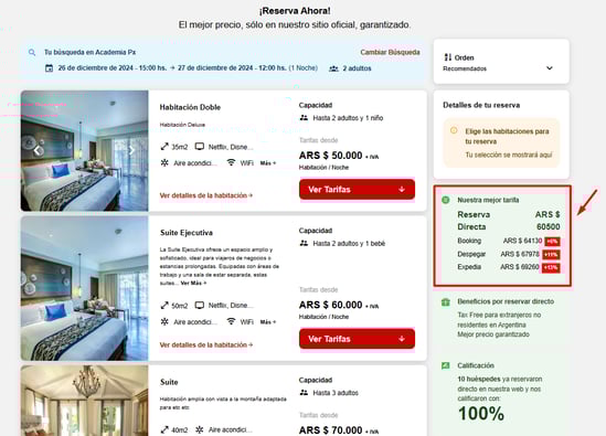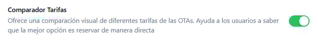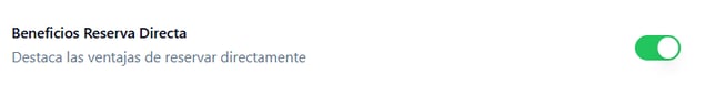 - Compra directa en el marketplace: Al activar esta opción, los visitantes del sitio permanecerán en el marketplace y no serán dirigidos al motor de reservas de cada hotel. Esto significa que, en lugar de ser redirigidos a una plataforma externa para completar su reserva, los usuarios podrán explorar y reservar directamente desde el marketplace.