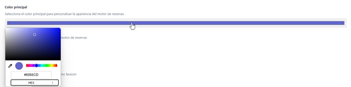 - Color principal: Selecciona el color principal que deseas utilizar, ya que este color será el predominante en la interfaz de tu motor de reservas. Opta por un color que se alinee con la identidad visual de tu marca.