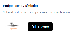 - Isotipo (icono / símbolo): Sube el isotipo o icono que deseas usar como favicon. El favicon es el pequeño icono que aparece en la pestaña del navegador y en los marcadores, y funciona como una forma de identificación visual rápida de tu sitio.
