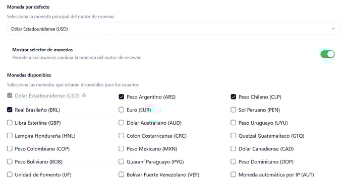 - Moneda: Esta opción te permite seleccionar la moneda en la que se mostrarán los precios en tu motor de reservas. Al seleccionar la moneda, asegúrate de considerar el mercado objetivo de tu negocio.
