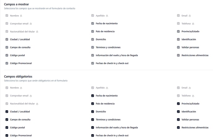 - Campos a mostrar y campos obligatorios: determina qué información se requiere de los usuarios en el formulario que deben completar al final del proceso de reserva para avanzar con su confirmación.