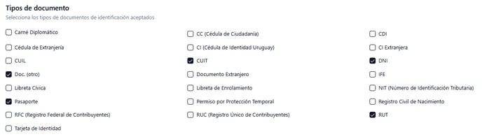 - Tipo de documento: Selecciona los tipos de documentos de identificación aceptados.