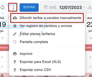 a- Dentro de la aplicación Tarifa y Disponibilidad, hacer click en los 3 puntitos del menú superior y hacer click en Difundir tarifas a canales manualmente