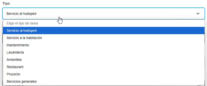 Tipo (Opcional): Seleccionar uno de los siguientes tipos de tarea. Si no selecciona ninguno quedará como Servicios generales.