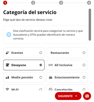 1 - Colocar la categoría del servicio. Por defecto, se presentan algunos servicios ya asociados a un ícono. Si el servicio que desea crear no aparece en la lista, podrá elegir la opción "Otros". Al seleccionar esta opción, se le mostrará un listado de íconos disponibles para que pueda asociar uno a su nuevo servicio antes de finalizar el proceso.