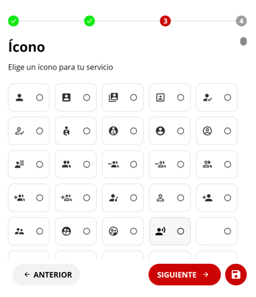 IMPORTANTE: Si desea cambiar el ícono de un servicio, debe seleccionar la opción "Otros" en el primer paso. Esto permitirá acceder al tercer paso, donde encontrará una variedad de íconos disponibles para elegir.