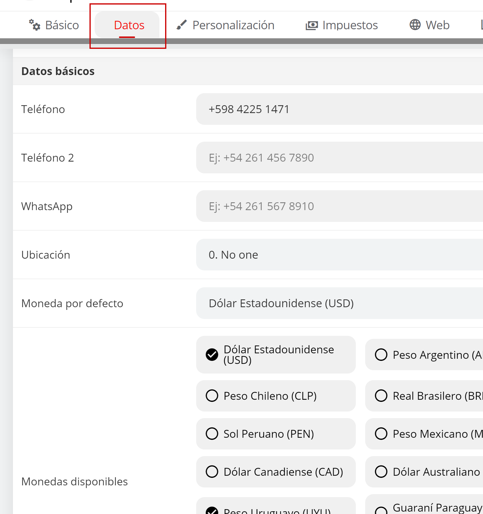 6- Luego hacer click en Datos y verificar/completar los datos del hotel para que aparezcan en el motor: Teléfonos, Ubicación, Moneda por defecto que debe mostrar el motor, y las monedas que aceptará el motor (monedas disponibles)