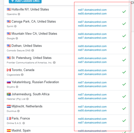 3- En el listado se desplegará el dominio en todos los países y a qué Name Servers apunta (debería apuntar en todos los países a los mismos name server)
